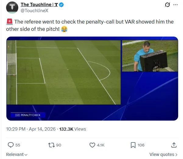 4月15日利物浦对巴黎圣日耳曼的欧冠四分之一决赛,VAR(视频助理裁判)系统上演了一出黑色幽默:当意大利主裁马里亚尼需要回看禁区内的疑似点球时,屏幕里播放的却是球场另一端的画面——那里风平浪静,连只鸟都没有。